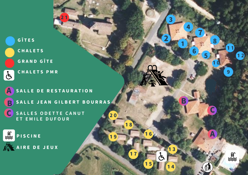 12 gîtes de 6 à 7 places / 5 chalets de 4 à 5 places / 3 chalets PMR de 4 places .(capacité d'hébergement jusqu'à 121 personnes).